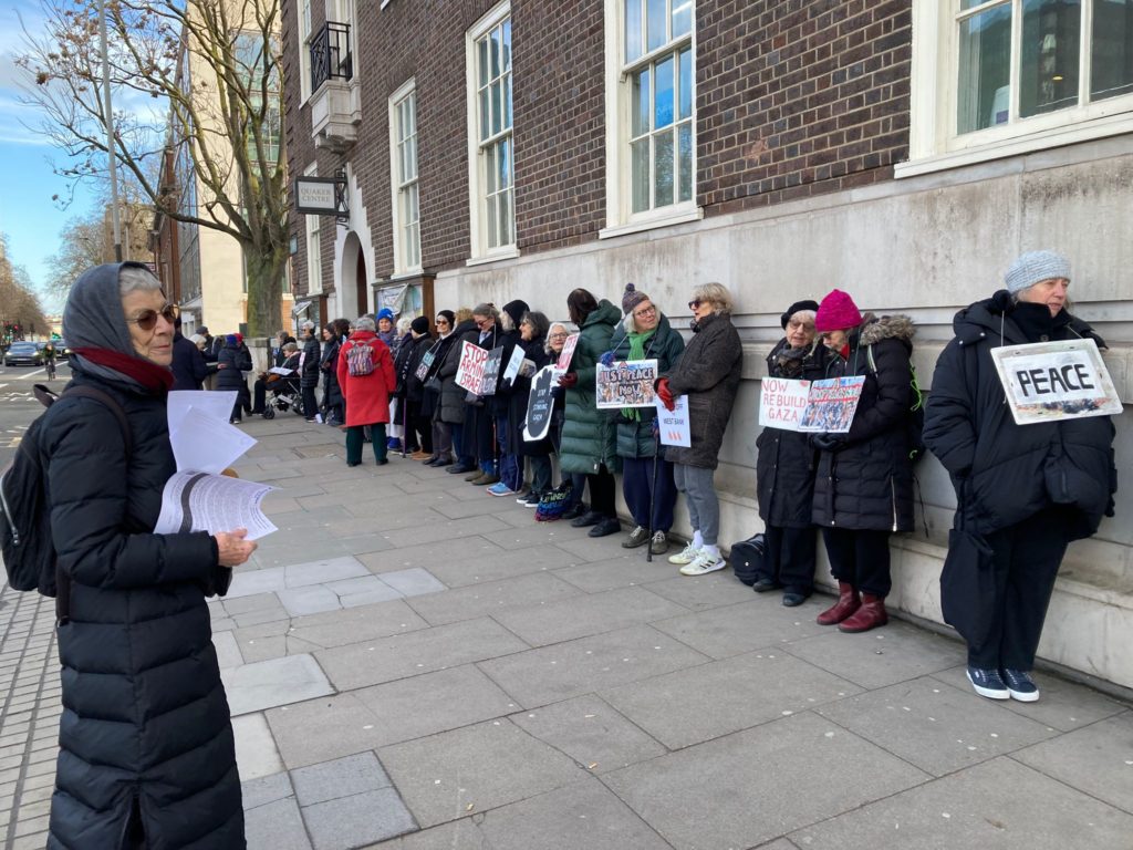 The Euston group started the Saturday after October 7th at the Southbank Centre, but were chased off by private security guards They moved to Euston Road the following week and there has been a vigil every Saturday since